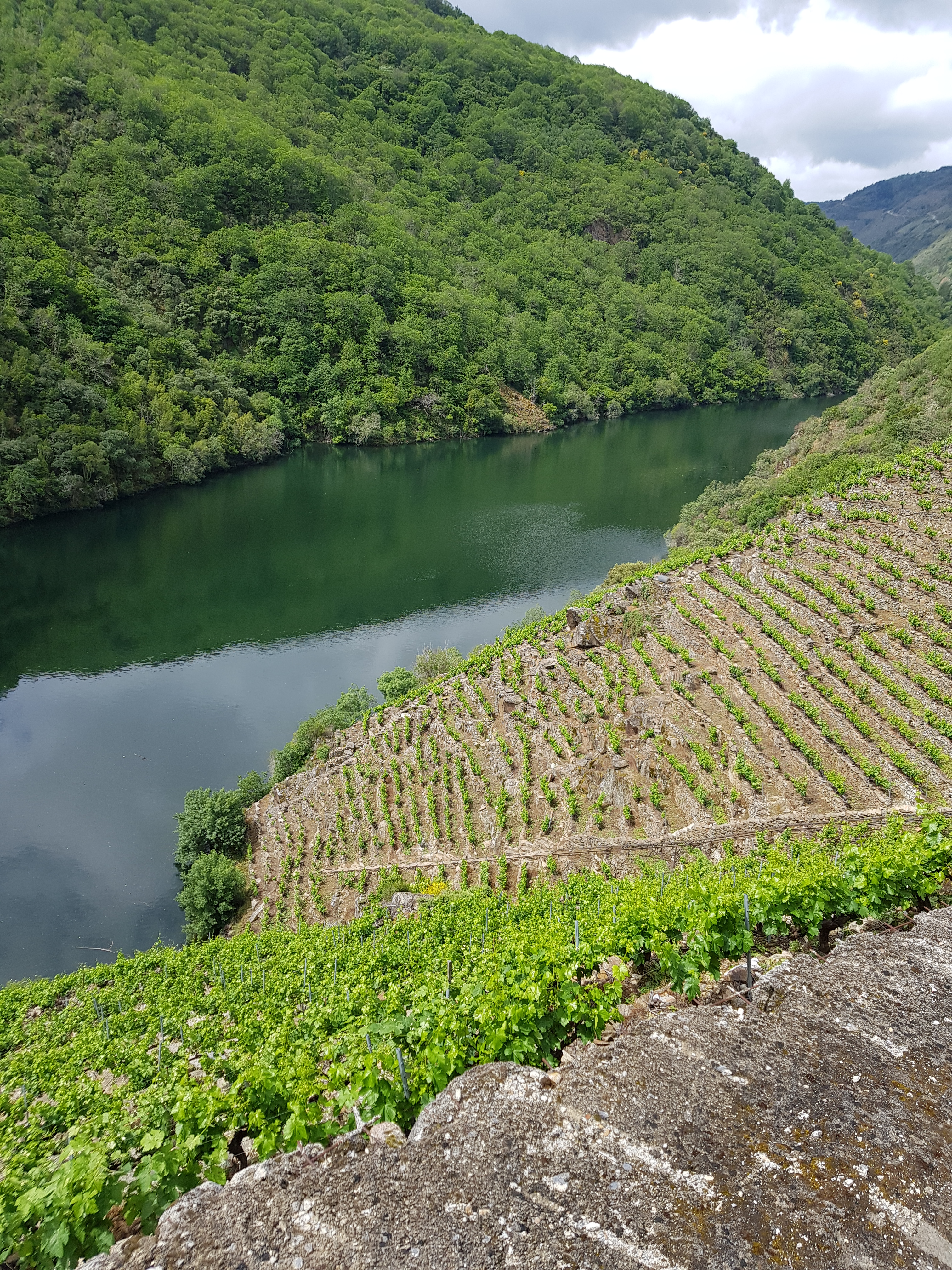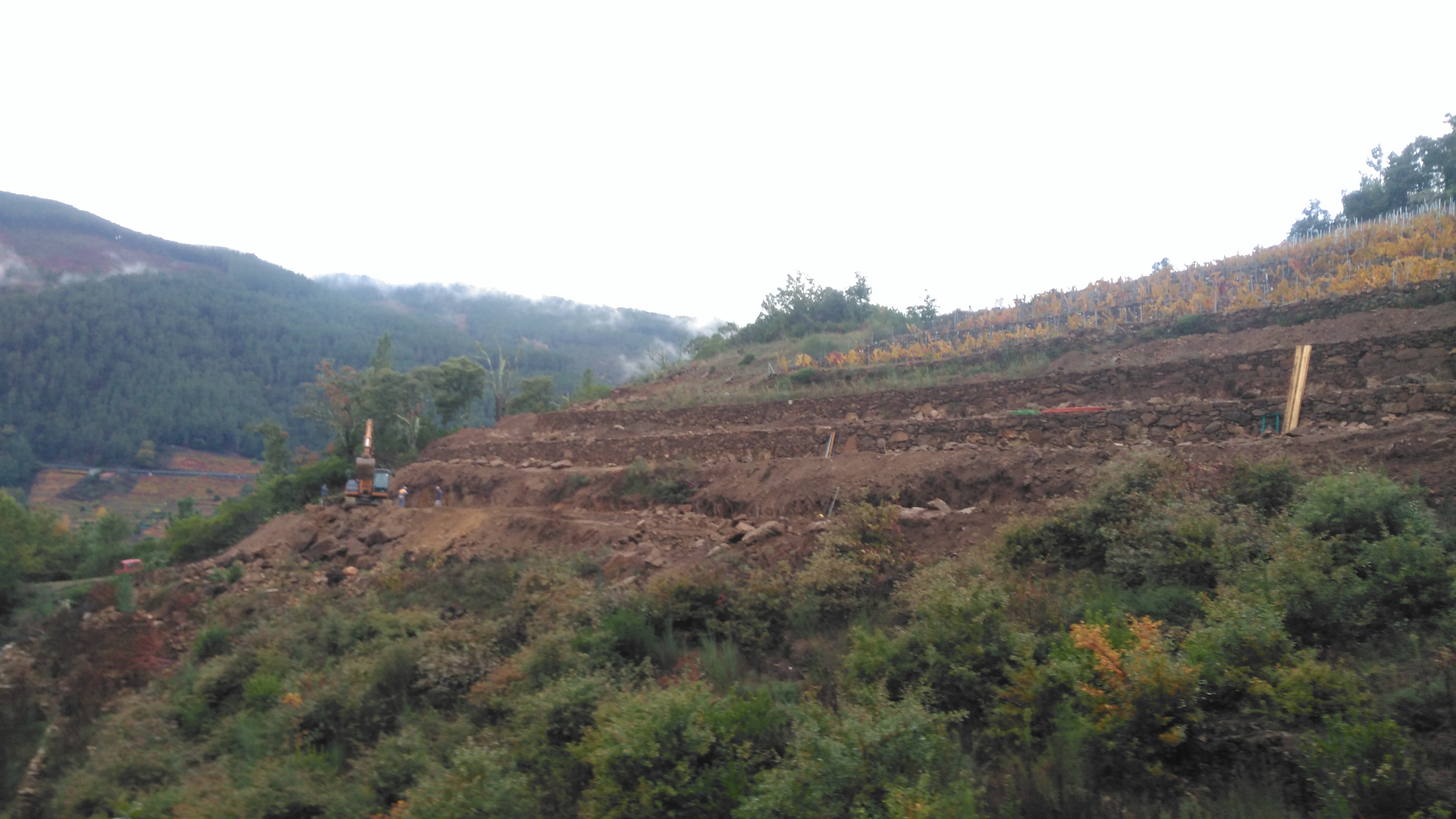 Actualmente estamos recuperando un viñedo del que solamente quedaban restos de los muros de piedra ( ya que fue abandonado hace más de 30 años ), situado en los márgenes del rio Miño. Aquí es posible hacer muros de piedra de 130 metros de largo y 2.50 metros de alto. Además al ser un suelo con abundancia de roca es posible introducir retro-excavadoras, con el fin de romper la piedra y permitir la penetración de las raíces .